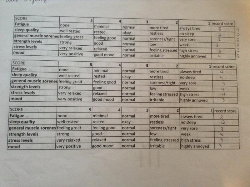 The 1st image below is a screenshot of our questionnaires during the off season training program. We noticed that by the end of the 3rd week, right before Christmas break, all of our guys were in need of some rest. Between fighting off colds, accumulating training volume and finishing out the school term, they weren’t in the best training shape. IÂ decided that using lighter weights and putting more focus on recovery for the week before their break would put them in the best position to come back after and get back to training hard. It did, and we saw a much more alert and eager to train athlete return.